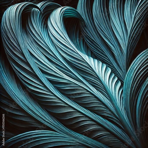 © Fuljan, Fototapeta premium Close-up of a blue-green spathiphyllum leaf on a dark backdrop, abstract botanical wallpaper. Created with generative AI technology