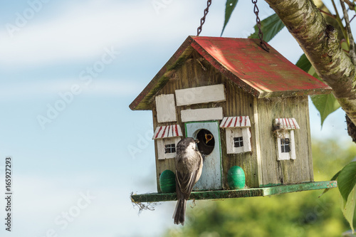 Fototapeta premium Close-up of a blue titmouse at a birdhouse