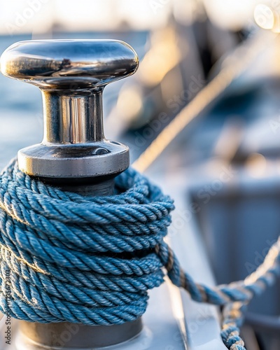 Obraz premium Close-up of a boat cleat with coiled blue rope.