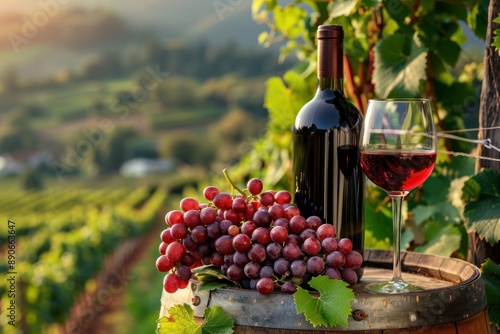 Fototapeta premium Close-up of a bottle of red wine, glass of red wine, bunch of ripe red grapes above an old wooden barrel