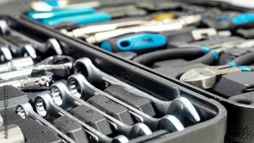 Fototapeta premium Close-up of a box with tools lies on the wooden floor against the backdrop of...