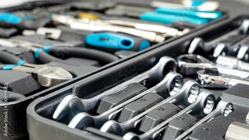 Fototapeta premium Close-up of a box with tools lies on the wooden floor against the backdrop of...