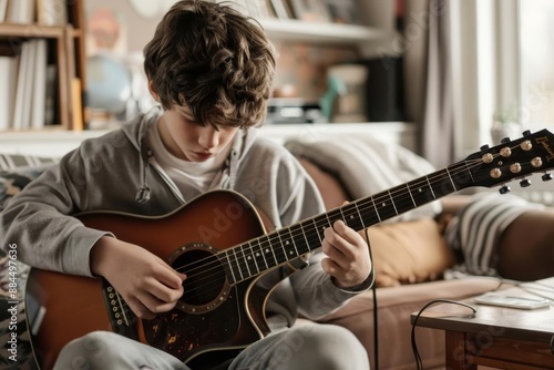 Fototapeta premium Close-up of a boy playing guitar in a living room, focused expression,...