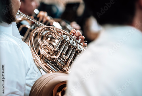 Fototapeta premium Close-up of a brass musician playing the French horn as a member of a band at a concert