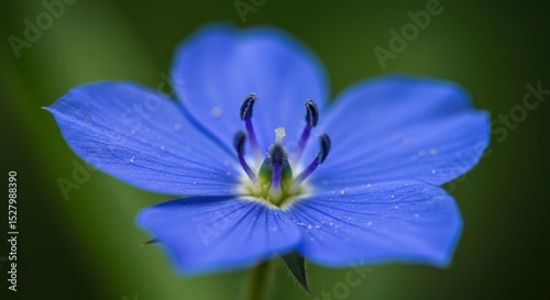 © Sya, Fototapeta premium Close up of a bright blue flower with five petals against a soft, blurred green backdrop