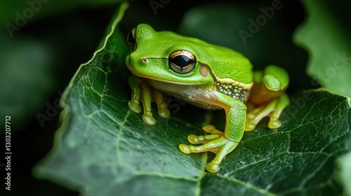 © Kittichet, Naklejka premium Close-up of a Bright Green Frog on Leaf in Natural Habitat