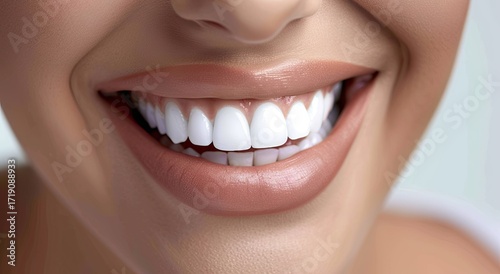 Obraz premium Close-up of a bright, healthy smile with perfectly aligned, white teeth and natural-looking pink lips. The image emphasizes dental health and beauty