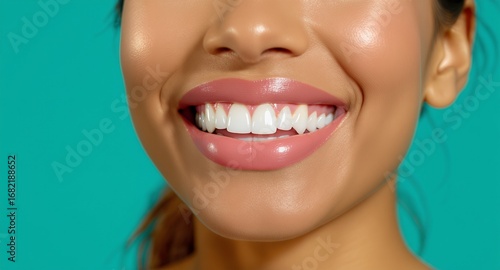 Fototapeta premium Close-up of a bright, healthy smile with pink lipstick against a teal background