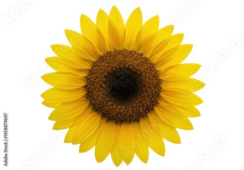 © stock.metket.com, Fototapeta premium Close-up of a bright yellow sunflower with a dark brown center against a clean white background, showcasing its vibrant petals