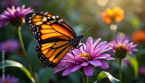 © Mr.Pancho Store, Fototapeta premium Close-up of a brilliant orange monarch butterfly resting on a bright purple wildflower, its wings shimmering in the sunlight against the vibrant backdrop of nature