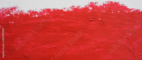 © nndanko, Obraz premium Close-up of a broad horizontal brushstroke of bright red paint on white paper.
