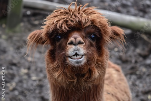 © StockUp, Fototapeta premium Close-up of a brown alpaca making a humorous face, standing on dirt with soft fur and hair over its eyes.