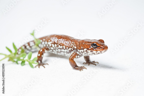 © Rysak, Naklejka premium Close-up of a Brown and White Spotted Lizard on a White Background