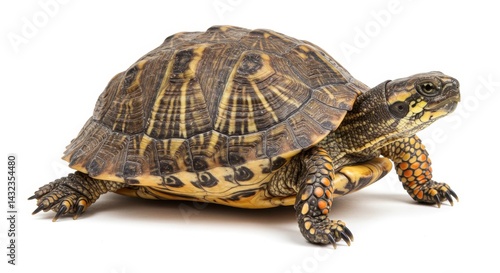 © Muaz, Fototapeta premium Close up of a brown and yellow turtle with patterned shell on a white background in studio lighting