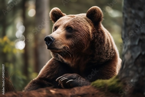 © Thares2020, Fototapeta premium Close up of a Brown Bear in the Spring Wilderness Forest Background