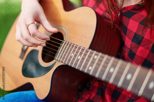 Fototapeta premium close-up of a brown classical acoustic guitar with the hand of a female...