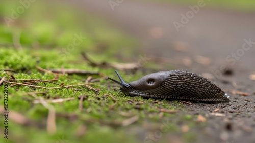 © andi, Obraz premium Close-up of a brown gastropod, slimy, on a mossy path outdoors