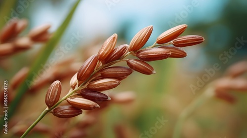 © Thares2020, Naklejka premium Close up of a brown rice stalk with textured grains set against a soft natural blurred background highlighting organic agricultural beauty