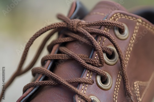 Obraz premium Close-up of a brown shoe with laces and eyelets, showcasing craftsmanship and...