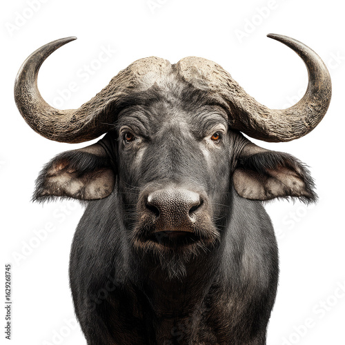 © New, Fototapeta premium Close-up of a buffalo's head, strong horns, intense gaze