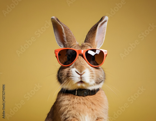 © H.S photography , Fototapeta premium close-up of a bunny with sunglasses, a white rabbit on a plain color background, a cute bunny wearing red sunglasses isolated on sunglasses, a stylish animal concept