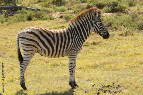 © Lynette, Naklejka premium Close up of a Burchell's Zebra foal standing in an open plain.