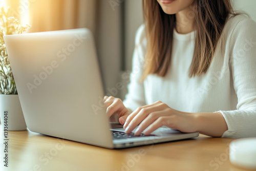 © Vitalii, Fototapeta premium Close-up of a businesswoman sitting at the table and working on a laptop
