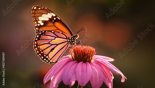 © Cory, Fototapeta premium close up of a butterfly delicately feeding on a pink flower proboscis extended droplet of nectar visible