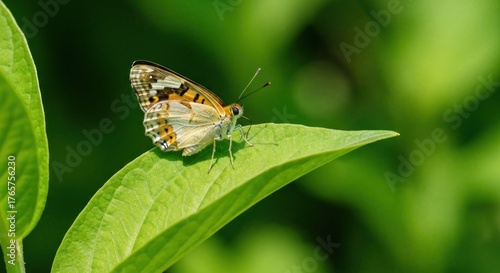 Obraz premium Close-up of a butterfly perched on a vibrant green leaf