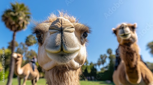 © At My Hat, Obraz premium Close-up of a camel's face, another camel blurred in background. Perfect for travel, animal, or funny stock.