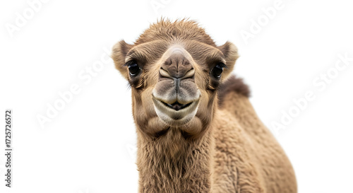 © Joao, Fototapeta premium Close up of a camel with light brown fur and a white background looking directly at the camera lens