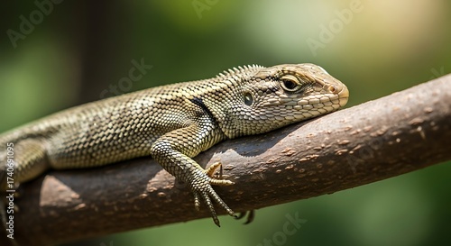 Naklejka premium Close-up of a camouflaged lizard resting on a textured tree branch in natural...