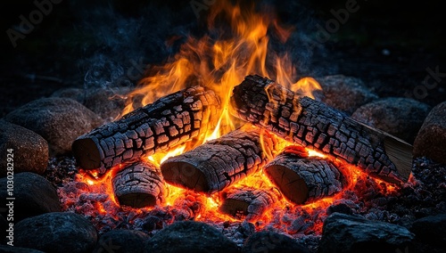Fototapeta premium Close up of a campfire with burning logs and glowing embers, creating a warm and inviting atmosphere.