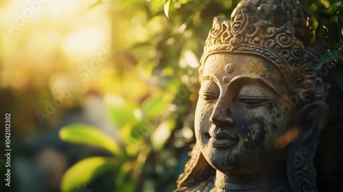 Obraz premium Close-up of a carved stone idol featuring detailed engravings set against soft greenery