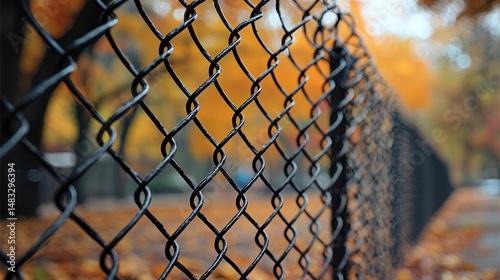 © Weather, Fototapeta premium Close-up of a chain-link fence, autumn leaves blurred in the background. Fall colors visible through the mesh