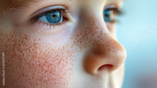 Fototapeta premium Close-up of a child's freckled face with bright blue eyes, showcasing facial features and textures, soft natural light ambiance.