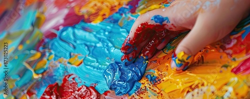 Fototapeta premium Close-up of a child's hand finger painting with vibrant colors, illustrating...