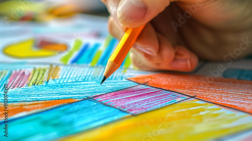 Fototapeta premium Close-up of a child's hand using a pencil to draw colorful geometric patterns...