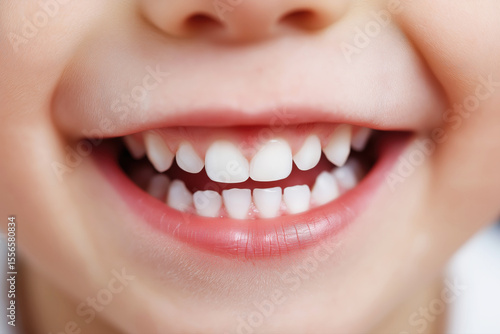 Obraz premium Close-up of a child's smile with clean white baby teeth. Happy expression. Perfect for dental care, oral health.