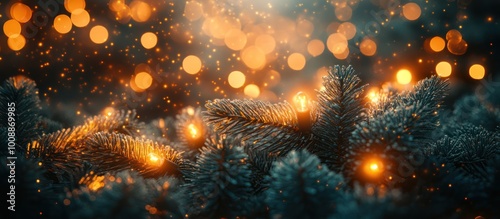 Naklejka premium Close-up of a Christmas tree with warm, glowing lights and a bok