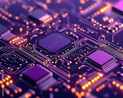 © Supriyono, Obraz premium Close-up of a circuit board with glowing components, intricate pathways, and a central processor