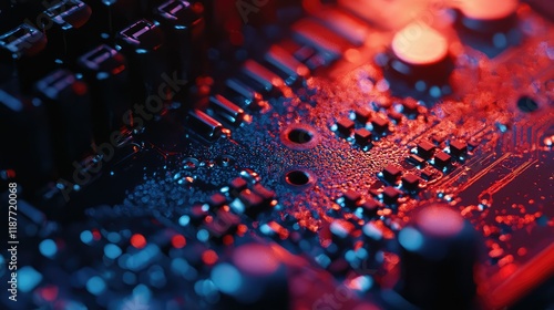 Fototapeta premium Close-Up of a Circuit Board with Glowing Red and Blue Lights