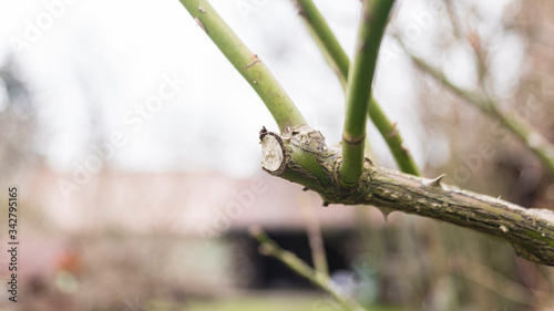 © Michal, Naklejka premium close-up of a clipped branch on a bush of roses