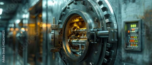 Fototapeta premium Close-up of a closed bank safe with mechanical lock and digital panel emphasizing safety and security. Useful for articles on security and financial services.