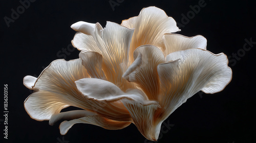 © Sabana, Fototapeta premium Close up of a cluster of oyster mushrooms with delicate gills on a dark background