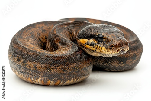 © Milaballe, Obraz premium Close-up of a coiled ball python with intricate scale patterns on white background