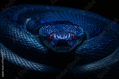 © MASUDHOSEN, Obraz premium Close up of a coiled dark blue snake with glowing red eyes