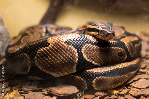 Obraz premium Close-up of a coiled python snake resting on the forest floor, showing...