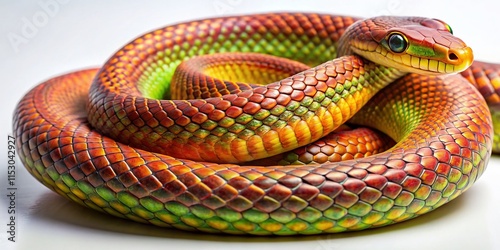 © Arnada, Obraz premium Close-up of a coiled snake on a pristine white background; perfect for reptile, wildlife, or nature-themed projects.