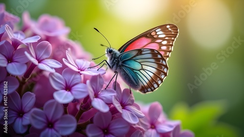 Naklejka premium Close-up of a Colorful Butterfly on Purple Flowers in Natural Light
